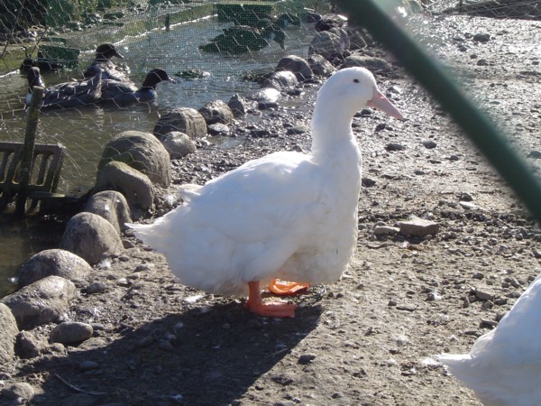 C'est un canard au corps rectangulaire, port horizantale , volumineux,aux plumage entiérement blanc pur