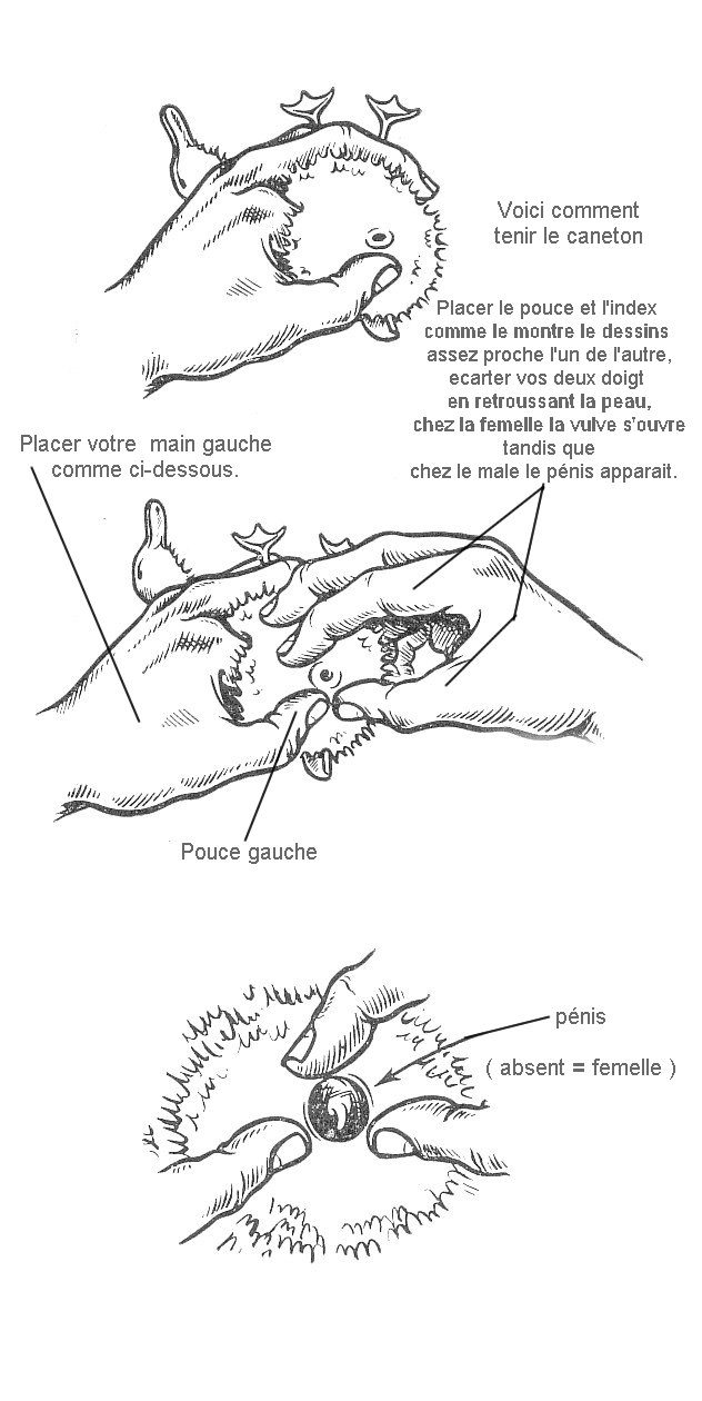 Le sexage des canards: Les males sont pourvues d'une ou plusieurs plumes frisées et recourbées( appeler crosse) au dessus de la queue, signe que ne porte aucune femelle. Seul les canards de Barbarie n'en posséde pas leur volume et beaucoup plus gros que la cane de barbarie. Si vous n'etes pas sur, faites comme indiquez ci-dessous pour l'oie.